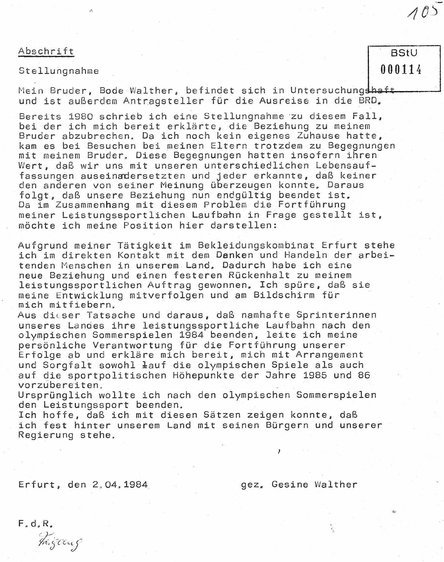 „Operative Einwände bestehen, da die Schwester des Beschuldigten Gesine Walther Leistungssportlerin ist. … Ihr Einsatz bei Wettkämpfen in nichtsozialistischen Ländern, könnte bei Übersiedlung des Beschuldigten nicht erfolgen.“
