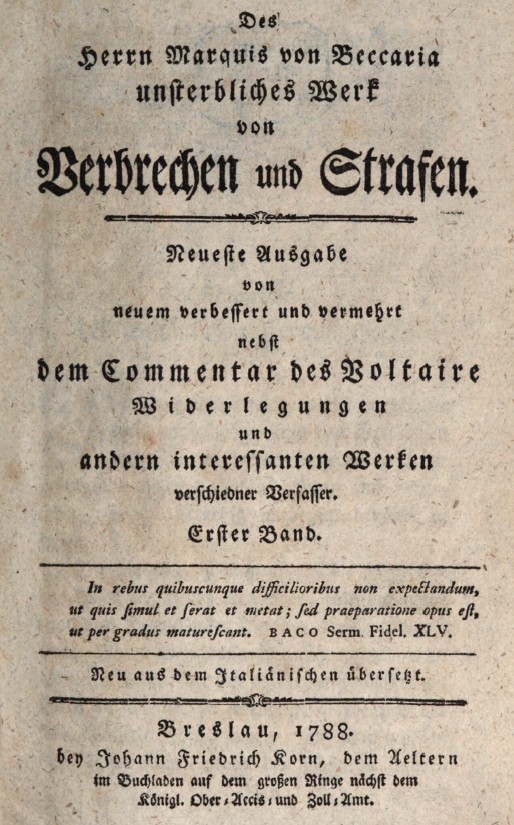 Aber das wäre jetzt ein Gedanke der Aufklärung. Cesare de Beccharia legte ihn dar in seinem Buch über die Verbrechen und Strafen von 1764. Auf deutsch erschienen ab 1766 in mehreren Übersetzungen.