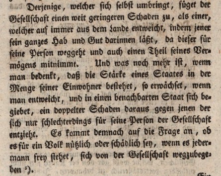 Auch hier stellt Beccharia fest: Ist die Tat vollendet, ist Strafe nicht mehr möglich. Weil der Flüchtige weg ist. Auch hier kann nur der Versuch bestraft werden. Ach, was heißt Versuch? Schon die Absicht müsse dann verfolgt werden. Und das würde den Staat in ein Gefängnis verwandeln. Das sei dann auch eine Warnung an jeden Fremden, sich dort auf keinen Fall niederzulassen.