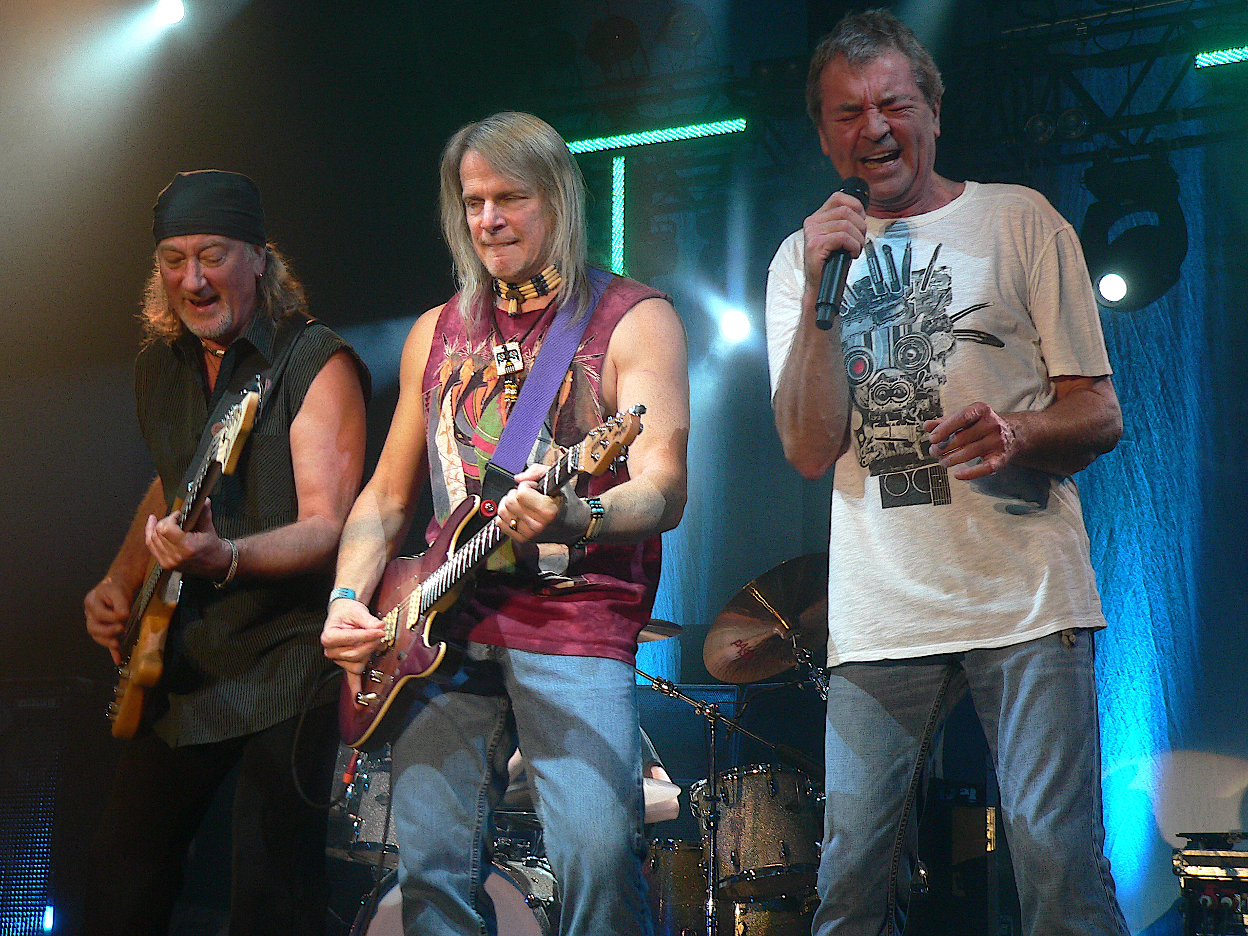 Da ist der Titelsong, dessen morgenländisch anmutende Harmonien noch vom 12 Jahre zuvor ausgeschiedenen Ritchie Blackmore stammen könnten. Da ist „Wrong Man“, ein aufgeblasener Riff-Rocker – soundmäßig ganz nahe an einem fetten Schwartenmagenbrötchen mit einer doppelten Ladung Senf. Eine Ballade gibt es auch mit „Clearly Quite Absurd“. Die ein Fingerzeig für Ian Gillans hörbar alternde Stimme hätte sein können: „Junge, wenn du in tieferen Tonlagen singst, klingst Du besser. Überlasse den Brüll-Tourette dem ehemalige Deep-Purple Bassisten Glenn Hughes, der bis heute so singt als gelte es, Risse in dicke Mauern zu singen“. Dann sind da diese Texte, die den immer wieder aufblitzenden Gillan’schen Humor zu neuen Höhen eskalieren. Der Sänger hat mir in einem Gespräch mal lang und breit den philosophischen Background eines seiner Werke erklärt, um dann abschliessend zu frotzeln: „Nimm bloß nicht ernst, was ich sage.“ Worauf ich antwortete: „Ich habe noch nie irgendwas ernst genommen, was Du mir erzählt hat“. Und er: „Guter Mann!“ Aber den hier, den sehr witzigen Text von „MTV“, den darf man gern ernst nehmen. Da amüsiert er sich prächtig über all die Journalisten und Moderatoren, die die Band konsequent auf „Smoke On The Water“ reduzieren wollen – und dabei nicht mal die Namen der Musiker kennen. „Mr Grover ’n‘ Mr Gillian / You musta made a million / The night that Frank Zappa caught on fire / Could you tell us all about it / Keep it short and use my version / Or everyone out there’ll think I’m a liar / We can speak about bananas for one second / Just because I understand / You have to get them off your chest / But in the meantime while your talking / Could you do some more of these here IDs / And then this station might maintain some interest.“ Oh ja, wer inemal beim Deppenradio gearbeitet hat (wie ich 16 Jahre lang) kennt das nur zu gut. Nebenbei sie noch angemerkt, das Deep Purple eine halbe Ewigkeit auf die Aufnahme in die Rock’n’Roll Hall Of Fame warten mussten, offenbar mit der Begründung, die Band sei doch ein One Hit Wonder.