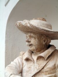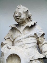 Und oben, über der Stadt, thront Schloss Hirschberg auf einem langen Bergrücken. Eine ehemals fürstbischöfliche Residenz, heute Bistumshaus. Wir wandern hinauf. Ein kurzer Weg, aber steil. Die Anlage entstand ab dem 11. Jahrhundert unter den Bischöfen von Eichstädt zunächst als Burg, was zwei mächtige Wehrtürme und der Burggraben zeigen. Das dreiflügelige Schloss mit seinem Ehrenhof wurde dann 1760-1764 unter Bischof Raymund Anton Graf von Strasoldo von seinem fürstbischöflichen Hofbaudirektor Pedetti als Jagdschloss im Stil des Spätbarocks erweitert. Der Schlosshof ist frei zugänglich. Die Besichtigung der Innenräume ist im Rahmen von Führungen möglich, aber auch von außen lohnt der Besuch: Da gibt es etwa die beiden skurrilen, expressiven Figuren aus Jura-Stein am Mittelportal des Saalbaues von Johann Jakob Berg. Sie stellen den Hof- und Küchenmeister dar. Was für sonderbare Gestalten! Auch die Hirschgeweihe auf Obereichstätter Gußplatten im Innenhof und die Toreinfahrt mit Tierplastiken sind sehenswert.