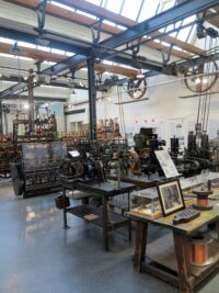 Das Museum in einer beeindruckenden historischen Shedhalle präsentiert Maschinen und Vorrichtungen zur Herstellung des Leonischen Grundmaterials und der daraus hergestellten Webprodukte wie Bänder, Borten und Brokate, die in Stickereien, Militäruniformen, religiösen Kunstwerken, Brautkronen, Schmuck oder auch in Weihnachtsdekorationen Verwendung fanden. Und die Vorführung an den historischen Maschinen lässt uns staunen: Der Erfindergeist, die Präzision, das technische Wissen, die den historischen Prozess der Drahtherstellung, Weiterverarbeitung und Veredelung ermöglicht, beeindruckt noch heute.