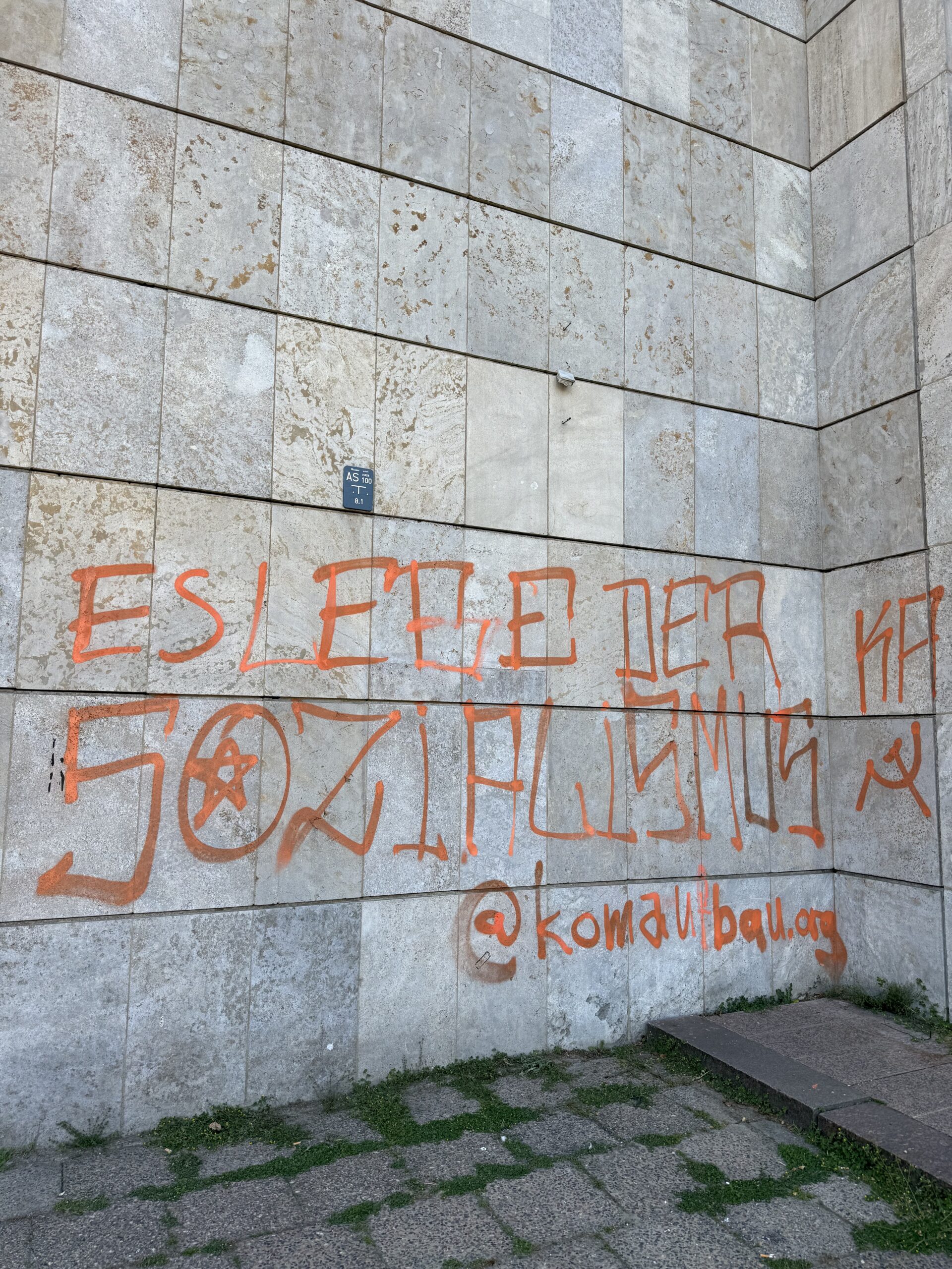 Immerhin wart ihr bei der Auswahl eurer Schmierereien ja schon sehr zielgerichtet: Zweiter-Weltkriegs-Schutt, von erzwungenen Sozialisten als Gebäude in Form gebracht, die lieber heute als morgen den Sozialismus in die Tonne getreten hätten. Es geht doch nix über knackige Autokratien. Ihr denkt ernsthaft, ihr seid gegen das „System“ und in dem System, dass ihr wollt seid ihr natürlich unter den Gewinnenden. Am Arsch die Mücken! In dem System, dass ihr wollt gibt es keine Gewinner. Ausser ein paar Nasen an der Spitzen.
