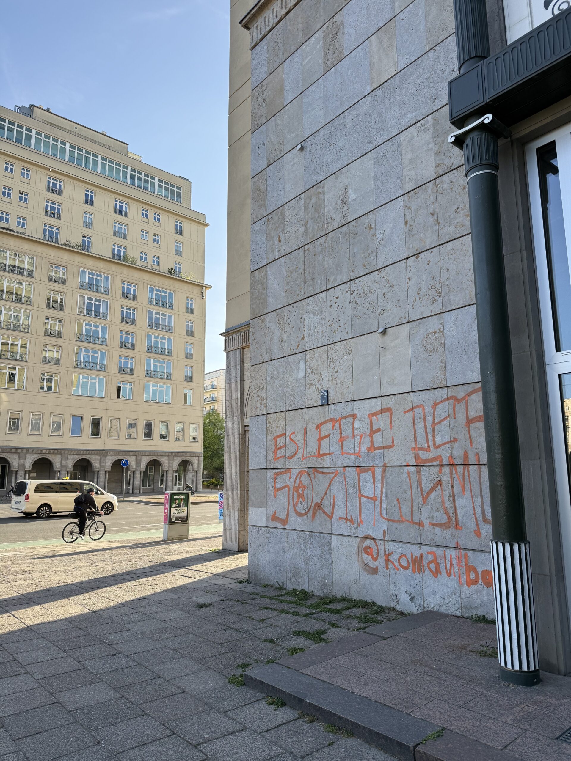 Übrigens ein Gebäude, das aus dem Schutt des Zweiten Weltkriegs erbaut wurde. Und weil ihr von Geschichte wahrscheinlich genau null Ahnung habt: Geht einfach mal in den Volkspark Friedrichshain, 500 m weiter, da gibt es den sogenannten Monte Klamotte – sieht aus wie ein Hügel, ist aber keiner, ist nämlich auch alles Schutt aus dem Zweiten Weltkrieg. Zurück zu dieser sozialistischen Prachtallee, die (übrigens völlig zu Recht) Europas längstes, zusammenhängendes Baudenkmal ist und die als am weitesten westlich gebaute Paradestraße im „sozialistischen Klassizismus“ gilt: